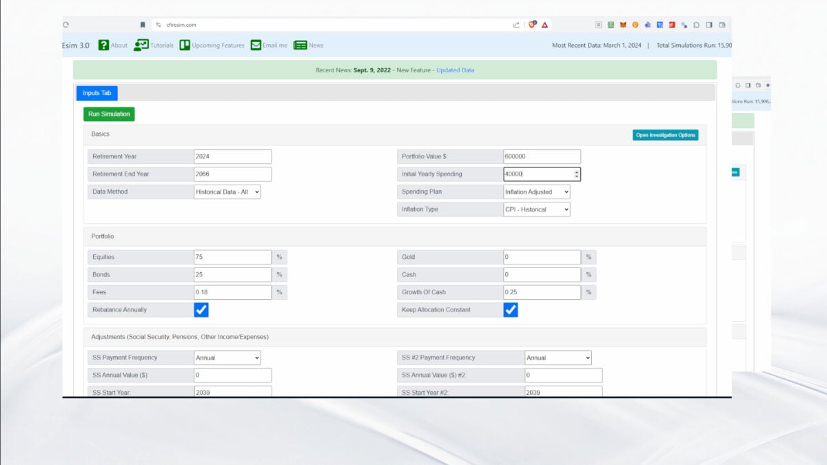 cFIREsim es un simulador que utiliza datos históricos del mercado desde 1871 para evaluar la viabilidad de diferentes estrategias de retiro. El simulador permite ajustar variables como el tamaño inicial de la cartera, la proporción de diferentes tipos de activos (acciones, bonos, oro), y la duración esperada del retiro, proporcionando así una plataforma robusta para desafiar la regla del 4%.